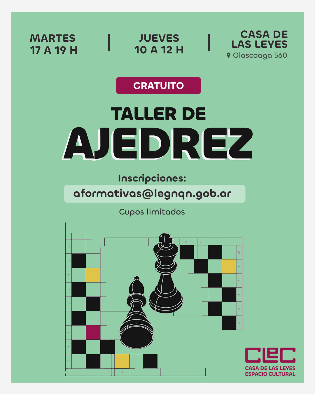 17:00 | Taller de ajedrez: Inicio 3 de marzo a las 17h - inscripciones a aformativas@legnqn.gob.ar. Días y horarios: Martes 17 a 19h - Jueves de 10 a 12h. Profesor Nuncio Ninone